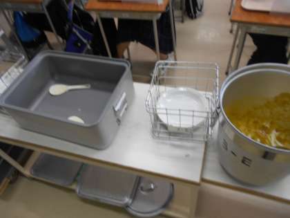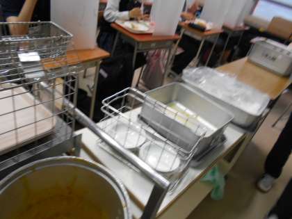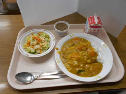 先日のメニューはカレーライス・チーズ入りフレンチサラダ・コーヒーゼリーでした。3А組と3E組が食品ロスを減らす目標で、完食をしました。いつも小食の人も、少し多めに。たくさん食べら出る人は大盛りに。担任も大盛りカレーを頑張って完食しました。