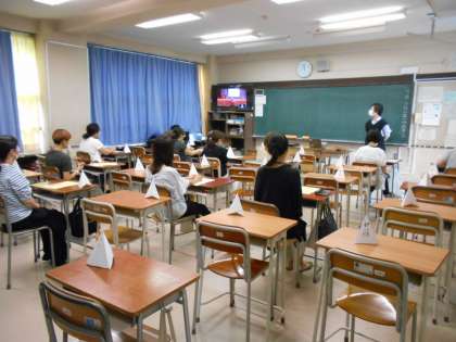 本日の保護者会全体会は3年生の保護者が体育館で聞き、1・2年生の保護者は各教室でZoom視聴しました。