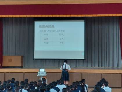 1つ目は、保健給食委員長から、学校生活における衛生面と安全面の諸注意。