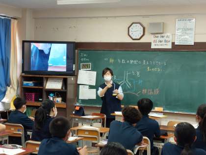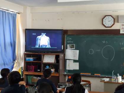 さらに、パワーポイントを用いてプリントと同じ内容を表示したり、ビデオを見せることで、呼吸の仕組みの理解を深めます。