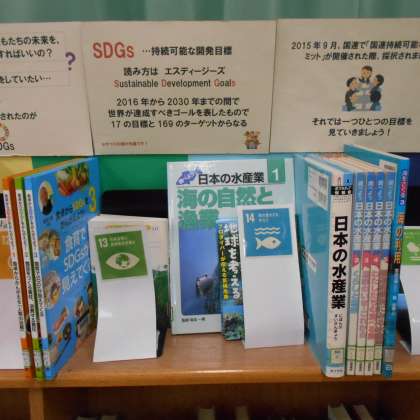 夏休みの図書室解放の前半は明日までで、しばらく休館となります。勉強の参考となる本や課題作文に参考になるSDGs関連本・環境に関する本など、コーナーを作っています。ぜひご利用ください。