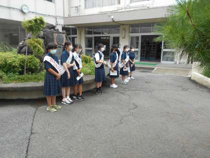 立候補者は夏休み中に作成した手作りのたすきを掛けて、投票を呼びかけました。