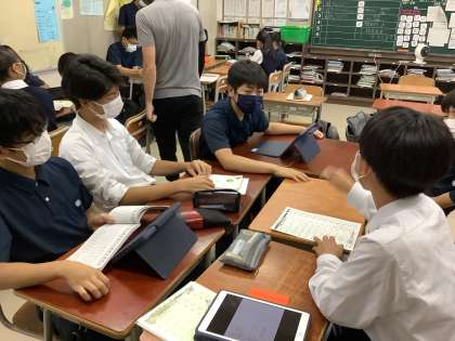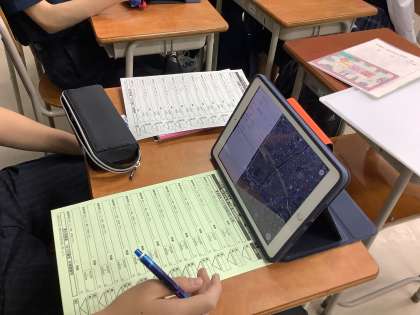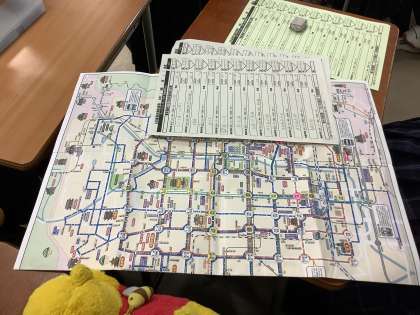 2日目の京都・奈良の班活動の見学場所や交通手段を確認して清書用紙に書きました。バス停の場所・時刻表など地図とipadを利用して班で話し合いました。