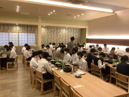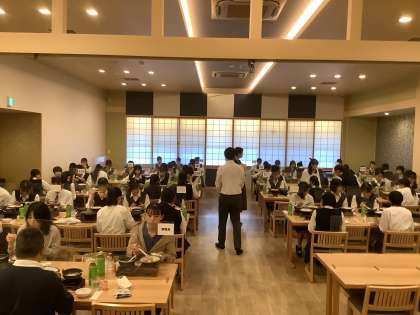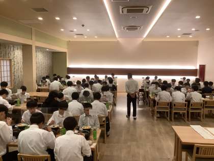 朝食は和食。温かいうどんや鮭・卵焼き、サラダなど。美味しくてペロリと完食している生徒が多くいました。目標の「黙食」も達成できています。