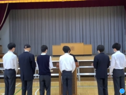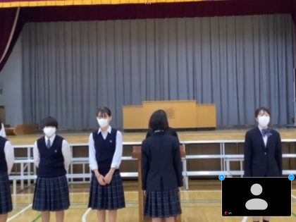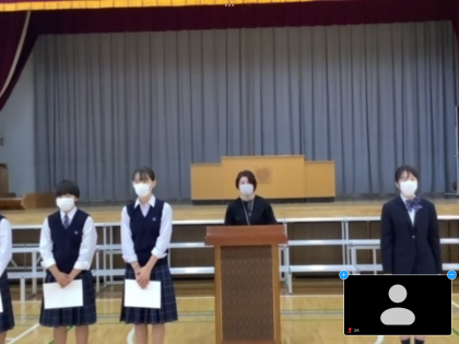 生徒会朝礼では、新生徒会役員と各委員会の委員長の任命式と世田谷区中学校陸上競技会の表彰を行いました。1・2年生が体育館、3年生がZoom視聴しました。