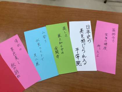 修学旅行の思い出を俳句で表現しました。訪れた神社や寺・城・庭園、宿で友と語ったことなど、思い思いの内容を創作しています。