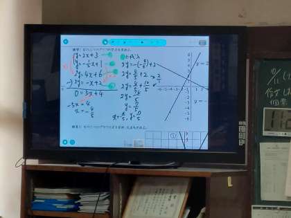 一次関数のグラフの交点の座標を、連立方程式を解くことで求められる力を育みます。