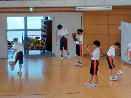 まず、iPadで、リフティングに関するYouTube動画を視聴します。考え、判断する時間を意図的に作ります。次に、練習する中で、生徒同士が動画を撮り合い、互いの良いところや課題を探り、協働的な学びを通して、リフティングを習得をしていきます。