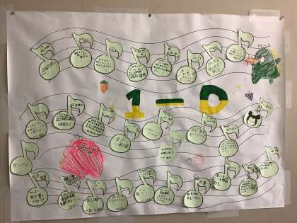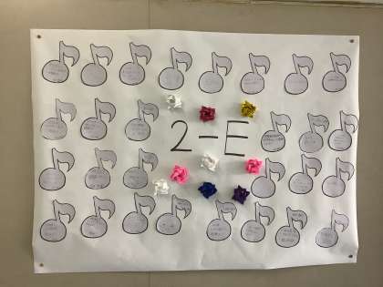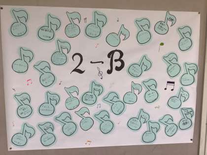 合唱コンクールへの意気込みをカードに書いて掲示しています。声量やハーモニー・音程など、それぞれの目標などを書いています。