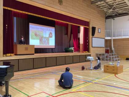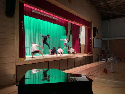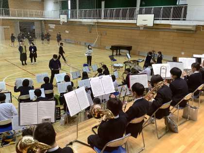 学芸発表会の午後に発表するEnglish Speachと、3年男子有志ダンス、吹奏楽部のリハーサルを行いました。実際に舞台をセッティングして通して練習しました。