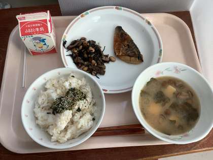 本日の給食は、玄米ご飯・じゃことわかめのふりかけ・なめこ汁・鯖のみぞれかけ・ひじきと大豆の炒め物・牛乳でした。