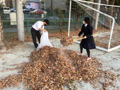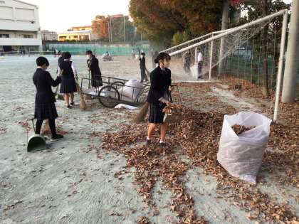 本日の放課後、落ち葉掃きボランティアを行いました。砧南中は毎年この時期になると校庭に多くの落葉があり、MYカンパニーさんの負担になっていました。そこで生徒会役員が参加を募ったところ多くの立候補があり、本日はそのうちの15名が参加しました。何度も踏んで乗って空気を抜いた袋が20袋近く集まりました。