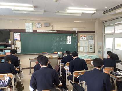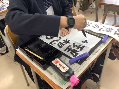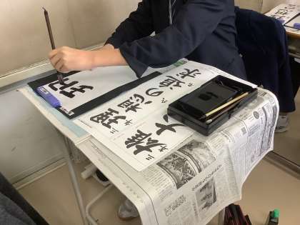 楷書「理想の追求」、行書「雄大な自然」の書き初め練習をしました。練習用紙に書くだけでなく、本番用紙に挑戦している生徒もいました。