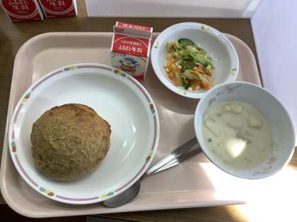 今日のメニューは「セサミビスキュイパン・ホワイトシチュー・チーズ入りフレンチサラダ・牛乳」でした。2Dで見事完食をしました。おめでとうございます。