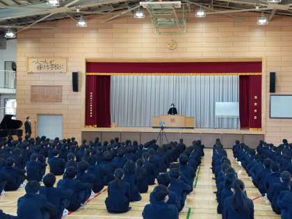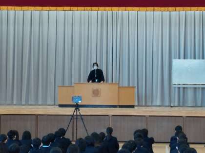 1、2年は体育館にて、3年は教室にてZoomで、始業式にでました。