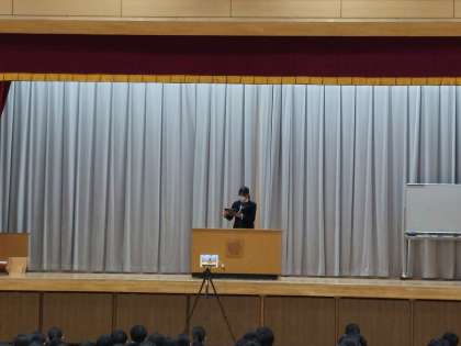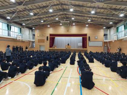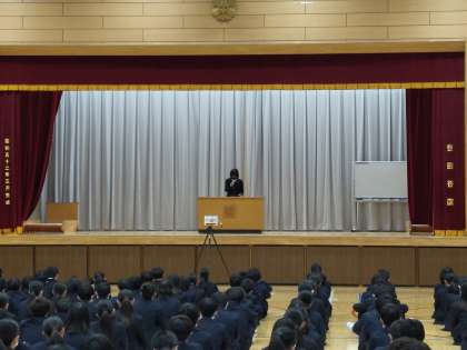 1、2年は体育館にて、3年は教室にてZoomで、行いました。