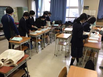 1年生は2月9日の校外学習に向けて準備を進めています。木曜日の放課後には班長会を行い、その後にはしおりの製本作業を行いました。月曜日には生徒に配布し、行程表や会計予算書を貼ります。会計予算書のご確認及びサインにご協力いただきありがとうございました。