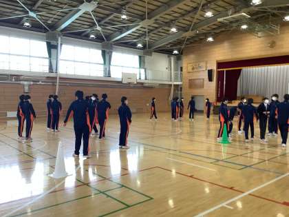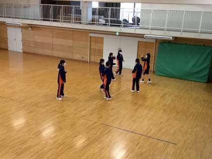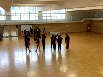 1・2年生の体育はダンスを行なっています。決まっている振り付け部分を覚え、自由振り付けの部分をグループで話し合い練習しています。