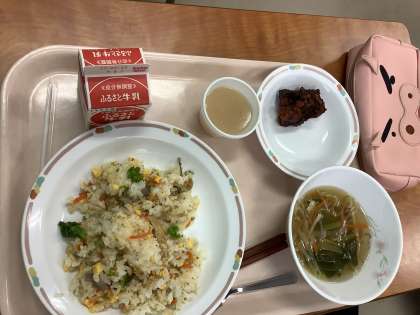 本日は、明日の「桃の節句」にちなんだメニューで、菜の花ちらし寿司・沢煮椀・イカのかりん揚げ・白桃ゼリー・牛乳でした。