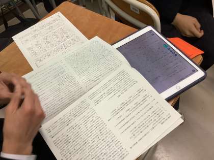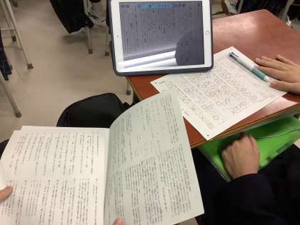 期末考査の返却がされています。3年国語科は、模範解答をiPadで配布しています。ICTを効果的に学習活動に取り入れることに加え、資源の節約ができています。