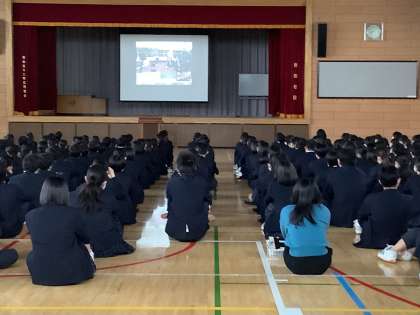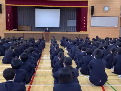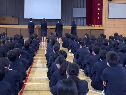 生徒会朝礼では、美化コンテストの表彰・生徒会サミットで発表した「砧南中学校紹介動画」の披露・屋上開放の利用ルールの確認を行いました。