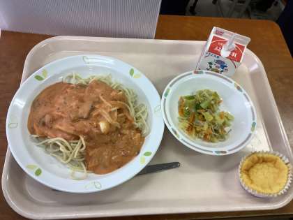 メニューは、トマトクリームパスタ・じゃこサラダ・チーズケーキ・牛乳でした。