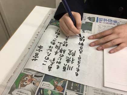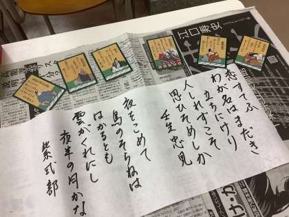 本日は書写をしました。奥の細道の冒頭を書いたり、百人一首のお気に入りの和歌を書いたりしました。