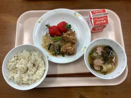 本日のメニューは、卒業生への祝い御膳でした。鯛めし・すまし汁・鶏の唐揚げ・小松菜入り春雨サラダ・いちご。どれもとても美味しくいただきました。