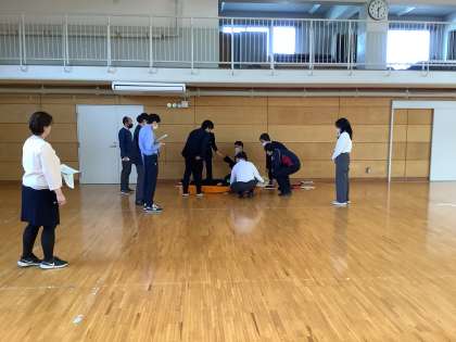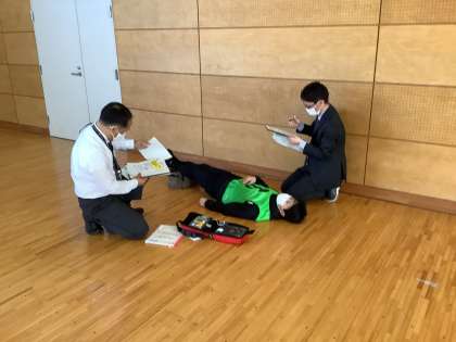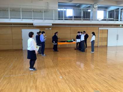 実際に役割分担をしてロールプレイング形式で、実際に保管場所からエピペンを持って駆けつけたり担架やAEDを用意したりしました。万が一に備えて再確認することができました。