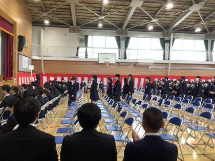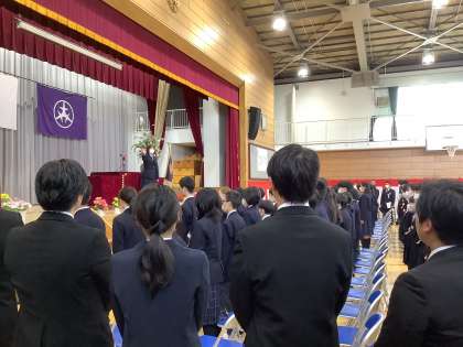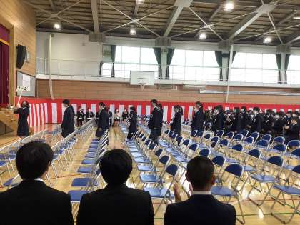 校歌斉唱。在校生が指揮・伴奏を行い、歌いました。
