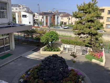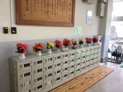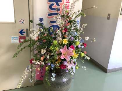 正門にある藤の花や友情の塔の周りの花がとても綺麗に咲いています。また、入学式で飾った花が校舎内に飾られています。和みますね。