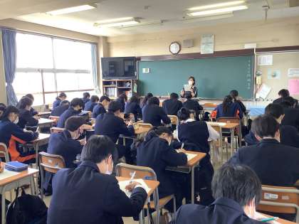 本日は「キャリア教育」の一環で、高校入試の基準について・自分の特性を振り返り、どのような職業に向いているか考えました。今年度は「職場体験」もあります。実践的に学べるのが楽しみですね。