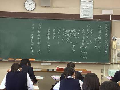 言語感覚を養い、言葉をよりよく使うための授業に交通安全川柳作りを取り入れました。交通安全を呼びかける言葉を考え、それらの言葉をどのように組み合わせると良いか考えました。