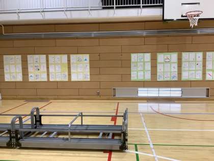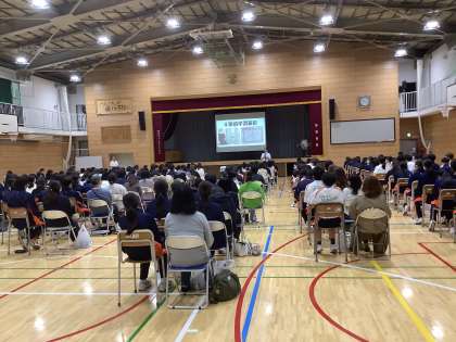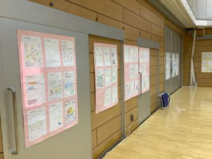 生徒と保護者に河口湖移動教室の説明をしました。事前調べの作品も体育館に掲示しました。
