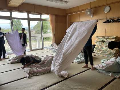 6時に起床をし、朝礼・朝食前に帰りの準備をしています。