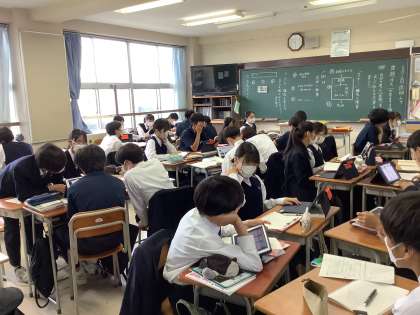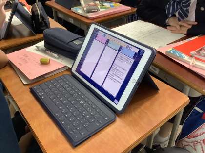 課題作文に取り組んでいます。まず、構成を考えました。iPadのシンキングツールを利用して入力し、その後3〜4人のグループで交流して助言し合いました。