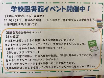 生徒会朝礼で委員長から説明がありましたが、今回「福袋」と「スタンプラリー」の2つのイベントを同時開催中です。夏休み特別貸出期間となり、一度に5冊借りられる今だからこそ行えるイベントです。
