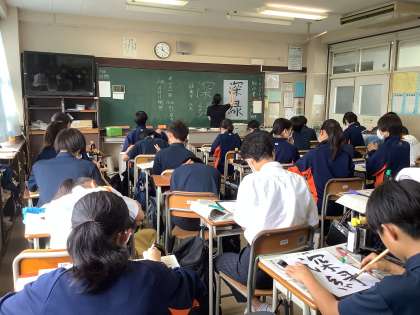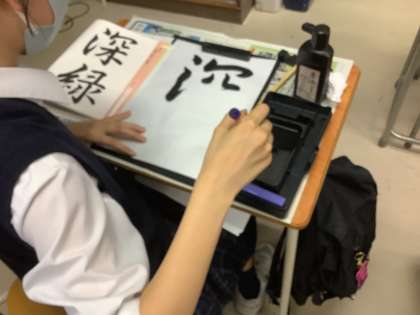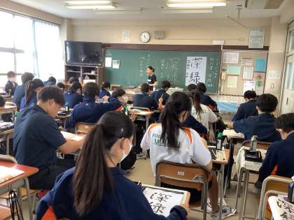 書写で行書体の「深緑」を練習しました。書写はお手本通りに書くことが大切です。高校で学ぶ書道の「臨書」につながるものです。手本をよく見てに忠実に書くことで文字の基本を学んでいます。