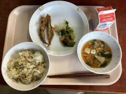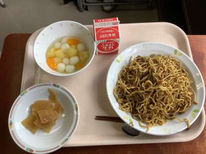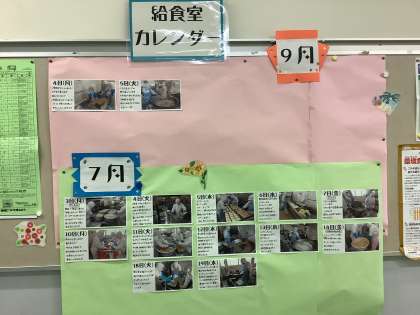 本日はみんなが大好きな焼きそばとフルーツポンチでした。和食・洋食など毎日美味しくいただいています。渡り廊下には給食を作っている様子がわかる「給食室カレンダー」があります。