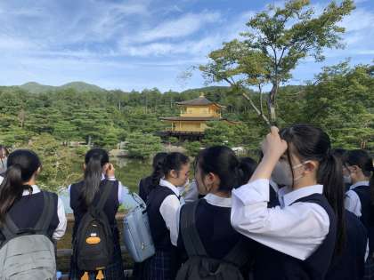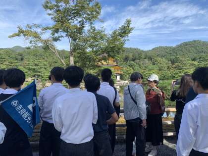 金閣寺グループ、青天の下、金閣寺の見学を終えました。