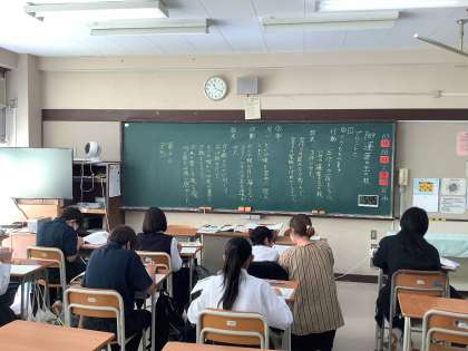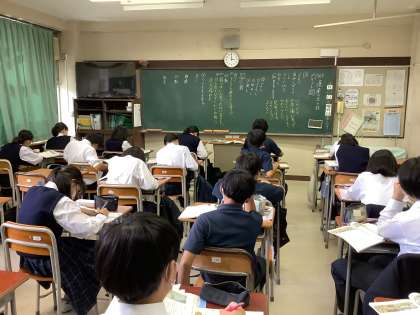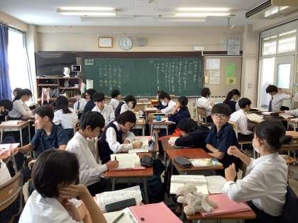 1年生は古文「竹取物語ー蓬莱の玉の枝」の学習をしています。2年生は「字のない葉書」の読解をしています。作者の想いの読み取りをした後、班で交流しました。