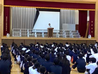 本日の生徒会朝礼では、後期の委員長の委嘱状を校長先生から受け取りました。また、今後の「部活動紹介ビデオの撮影」や「落ち葉はき」についての説明がありました。