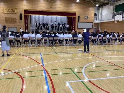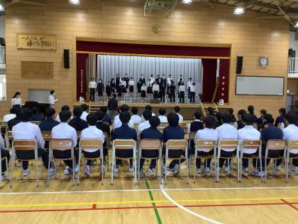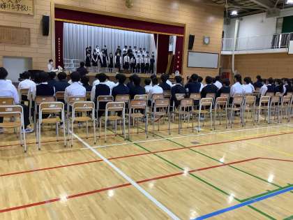 本日は、入退場・ステージ上のマナーの確認と課題曲の練習を行いました。音楽科の先生から、歌の入り方や声の伸ばし方などの助言をいただきました。