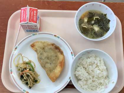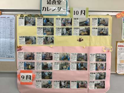 渡り廊下に貼ってある給食カレンダーでは、給食を作っている写真があり、見応えがあります。
