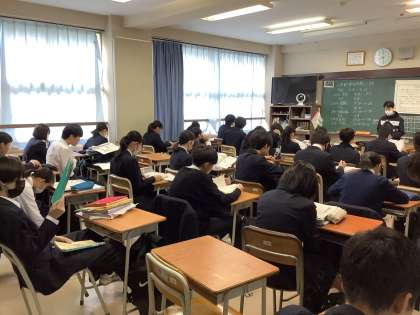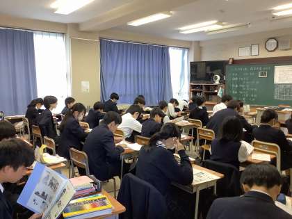 本日は国語・技術家庭科・美術の試験があります。生徒達は試験前に最後の見直しをしています。国語ではリスニングテストもあります。