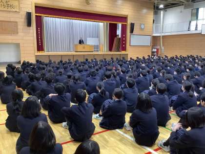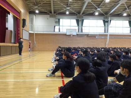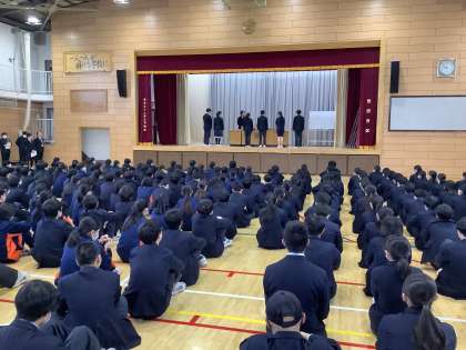 まず副校長先生の話がありました。3学期が残り7週間であること・その限りある時間で考えて欲しいこと・取り組んでほしいことなどを話しました。また、学校生活について教員からの話・表彰が行われました。