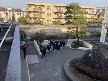 おはようございます。良い天気ですね。本日も一日充実した日にしましょう。登校中、校舎周りを教職員が見守りをしています。