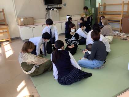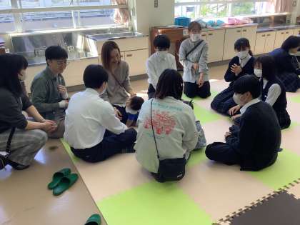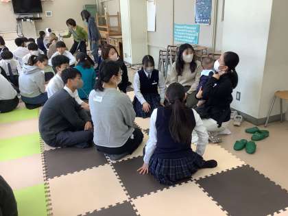 家庭科の授業で保育実習を行いました。生後3ヶ月から1歳5ヶ月ほどのお子さんをお迎えしました。本日は11組の親子に協力していただきました。どうもありがとうございました。
