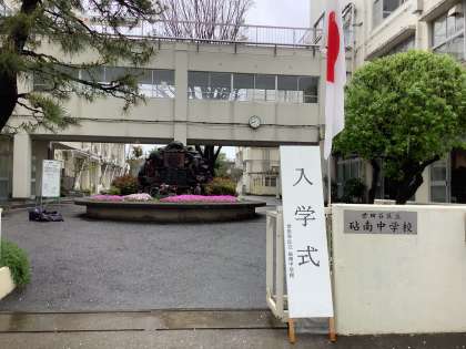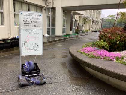 本日入学式です。新入生は右手の生徒玄関・保護者は左手の体育館下入り口からお越しください。