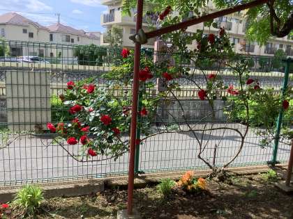 正門近くのバラが満開になりました。また、3年前の3年生が修学旅行先の広島からいただいたアオギリが大きく成長しました。